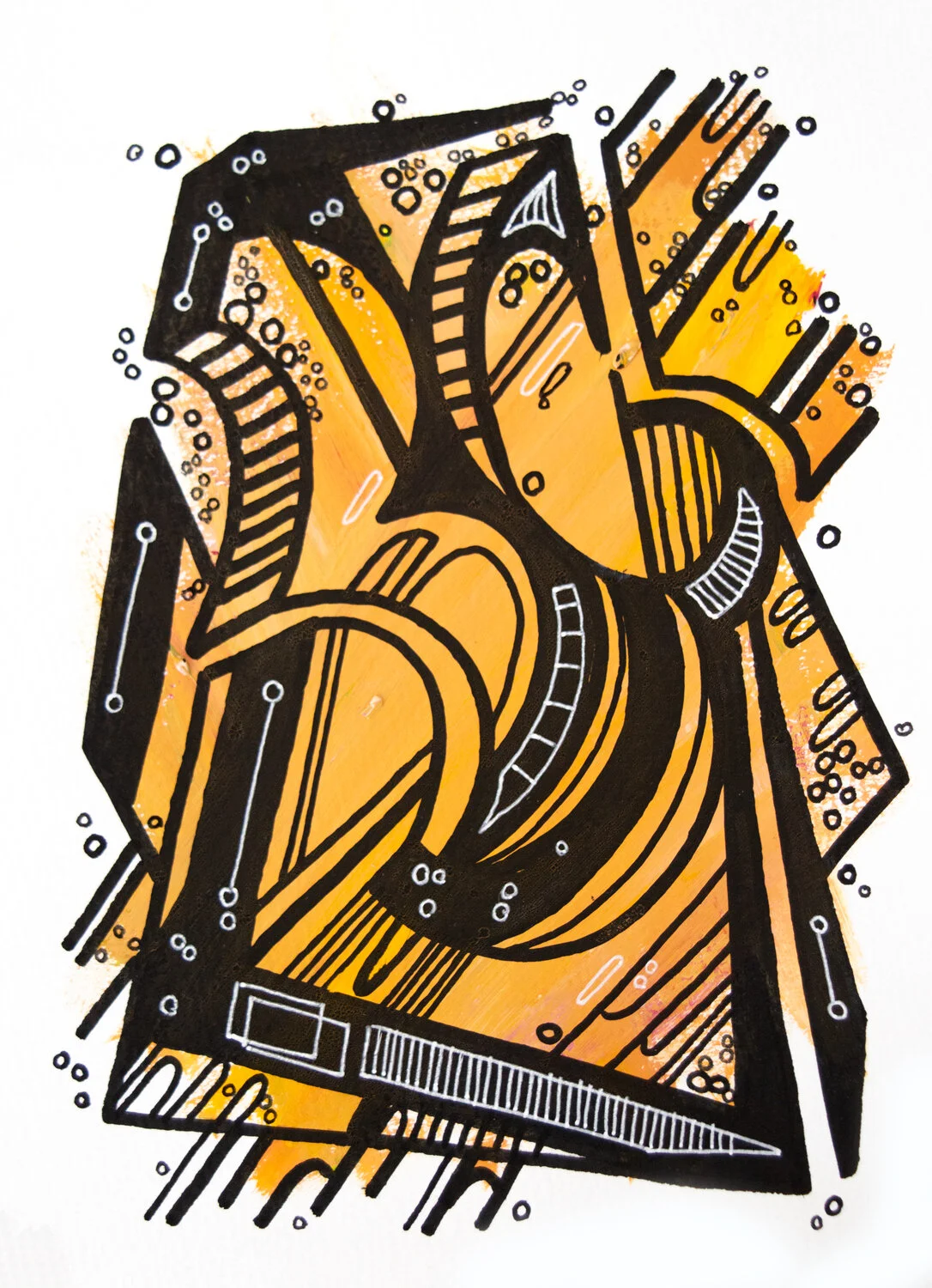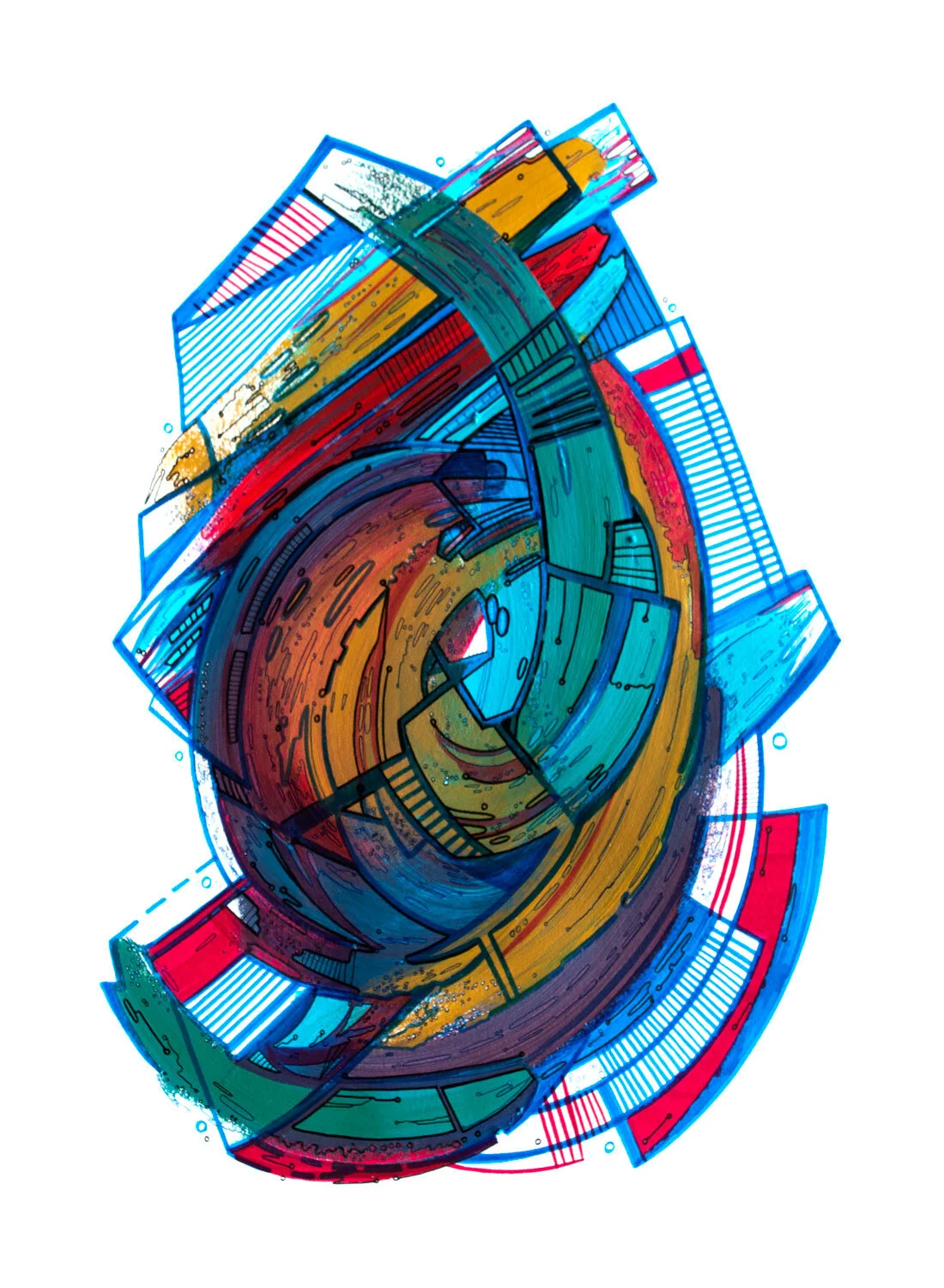 Mixed media on paper. Acrylic paint and pigment, coloured markers and ink.