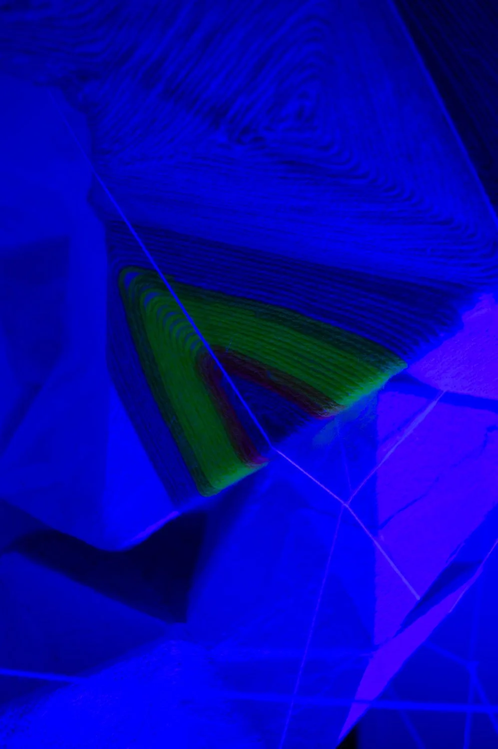 Sculptural objects (plaster, cardboard, yarn), white string, blue fluorescent tube lighting. Dimensions of the room / 10’ x 8’ x 71/2’
